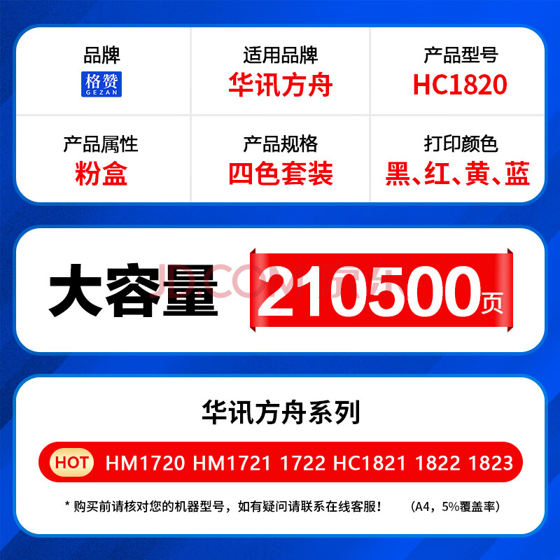 商品相册:格赞 HC1820粉盒四色套装 适用华讯方舟HM1720硒鼓HM1721 HM1722 HM1721X HM172X复合机墨盒墨粉第