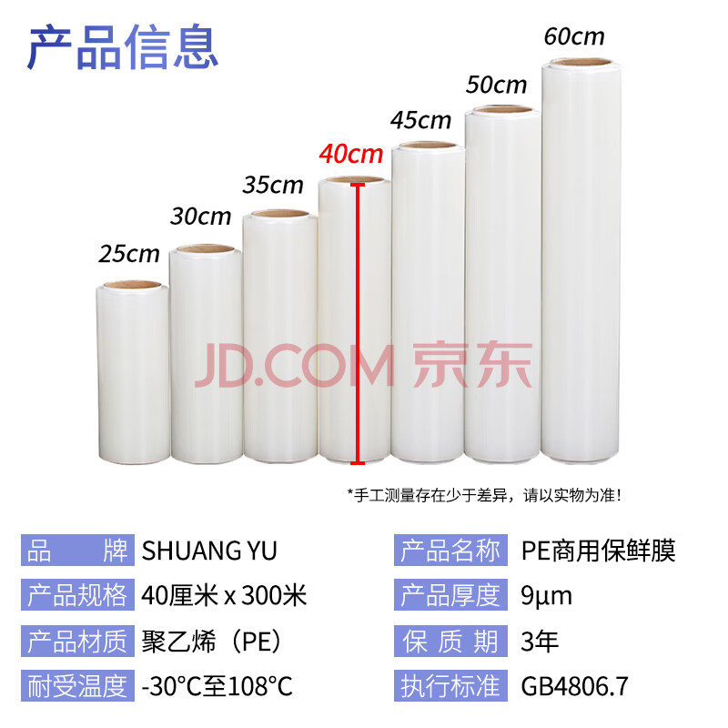 商品相册:SHUANG YU大卷保鲜膜【PE食品级300米*40cm】耐高温食品膜冰箱微波适用第