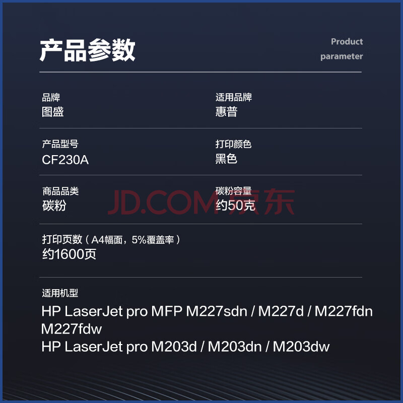 商品相册:图盛CF230A碳粉适用惠普m227fdw硒鼓m203dw墨粉m203dn m203d m227d/sdn/fdn打印机硒鼓墨盒 hp30a粉盒碳粉第