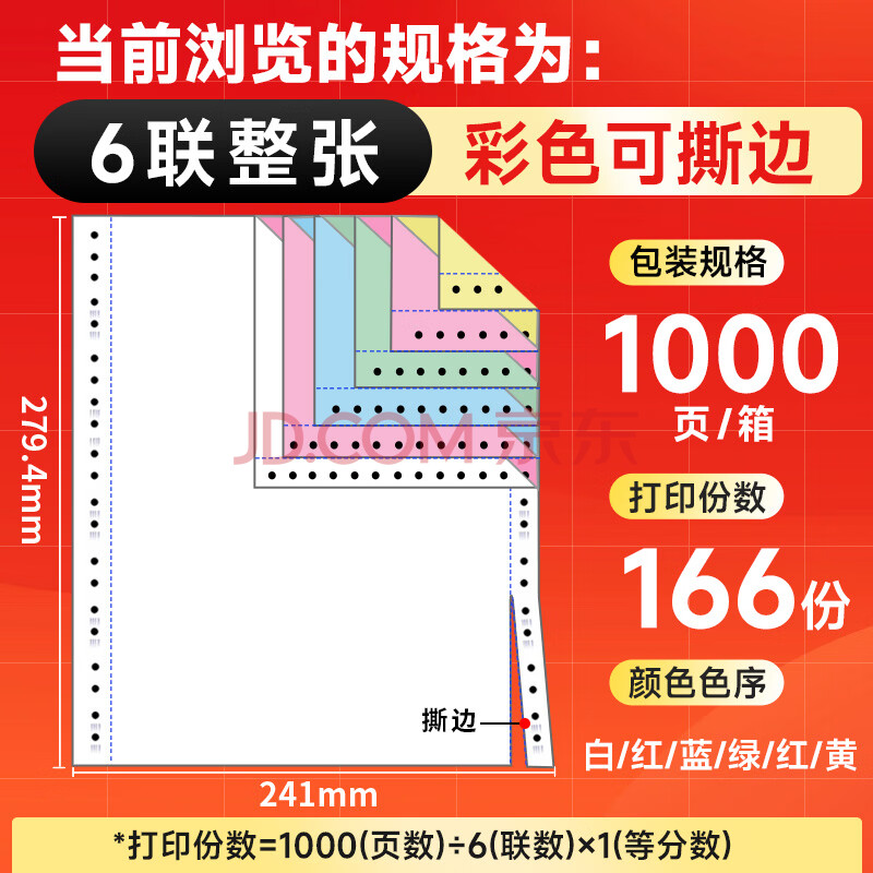 商品相册:天章 (TANGO)【缺页十倍赔】天章龙 六联整张针式 撕边电脑打印纸 出入库送货清单1000页 241-6S(白红蓝绿红黄)第