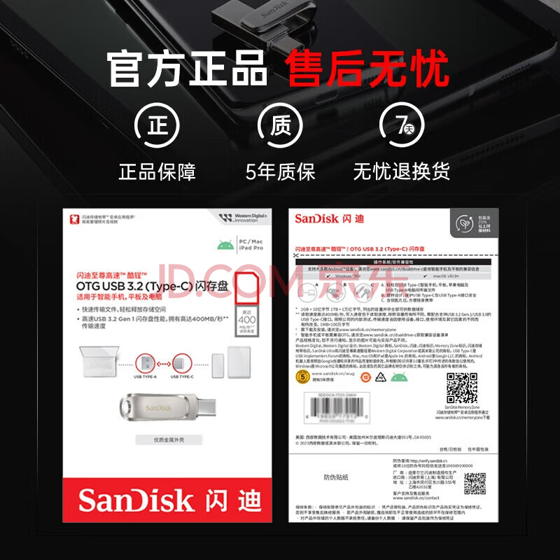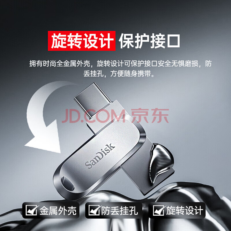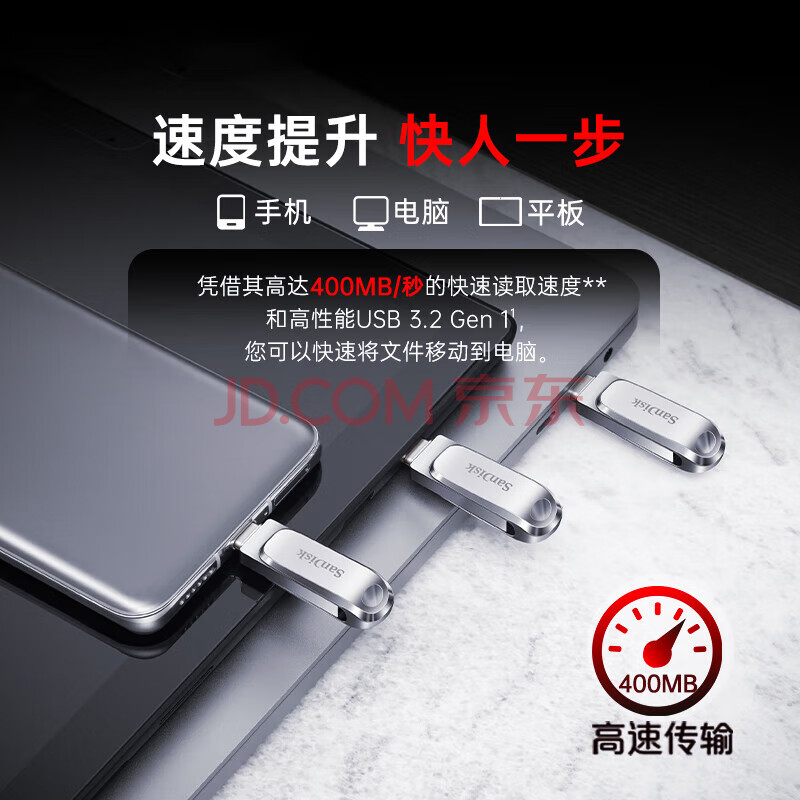 商品相册:闪迪(SanDisk)256GB Type-C USB3.2 手机U盘DDC4 读速高达400MB/s 自动备份 手机电脑两用 金属双接口大容量优盘第
