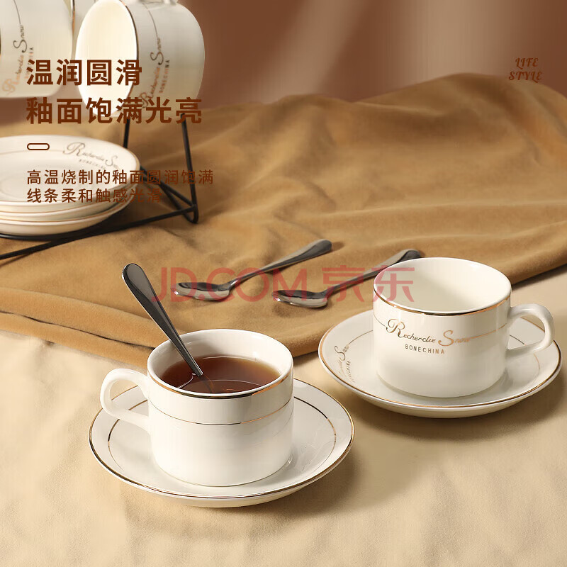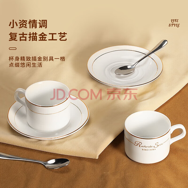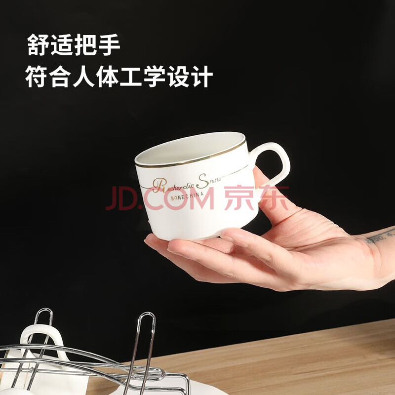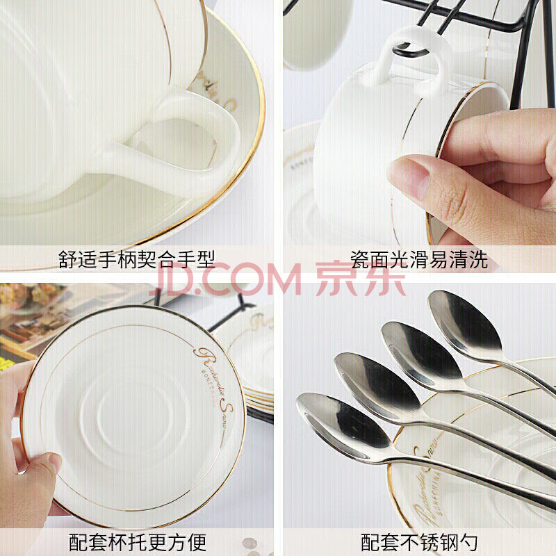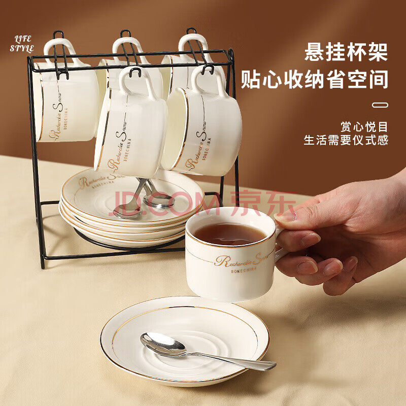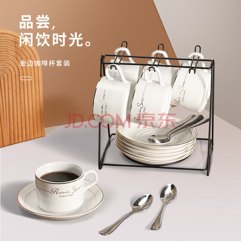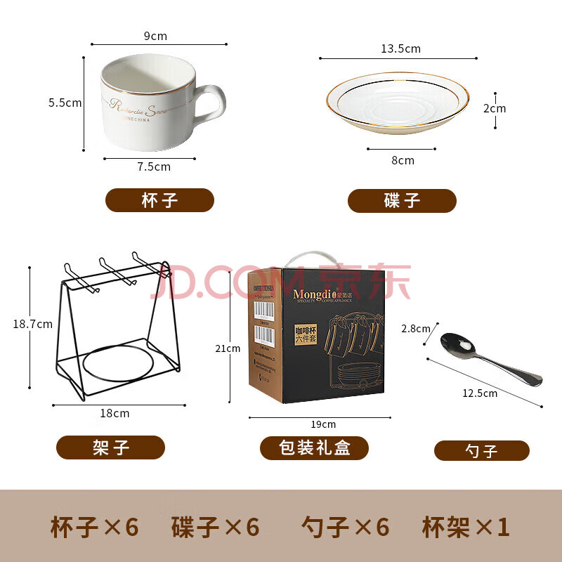 商品相册:Mongdio咖啡杯套装欧式金边陶瓷杯马克杯水杯子挂耳6杯6碟6勺1杯架礼盒装第1张/共9