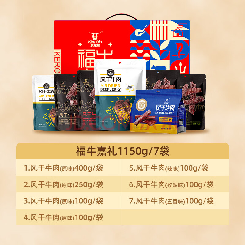 商品相册:科尔沁八方来财 风干牛肉干1150g纯肉礼盒 休闲零食肉脯 节日团购送礼第