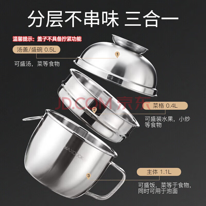 商品相册:美厨(maxcook)不锈钢饭盒 快餐杯碗学生饭盒 泡面碗泡面杯 二层14cm MCFT047第1张/共8