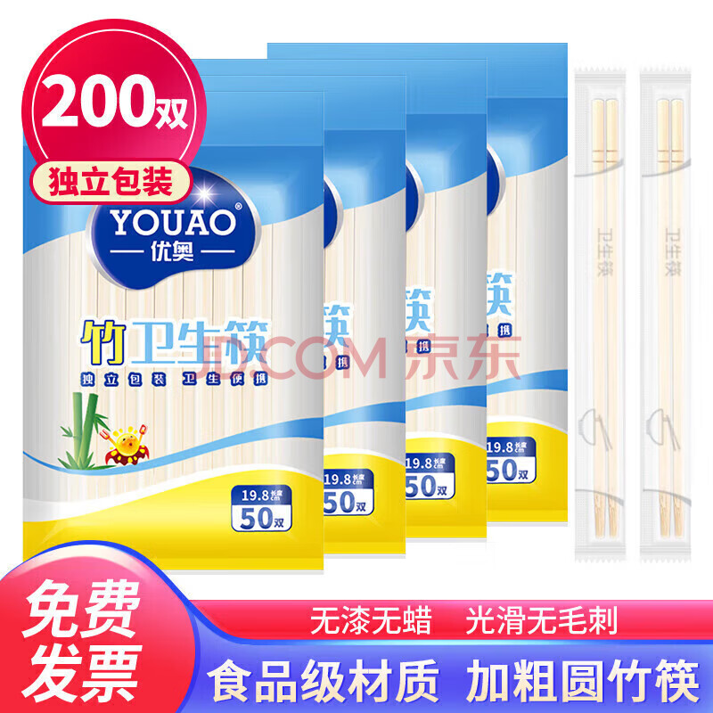 商品相册:优奥 一次性筷子200双独立装卫生竹筷方便筷 一次性碗筷餐具用品第