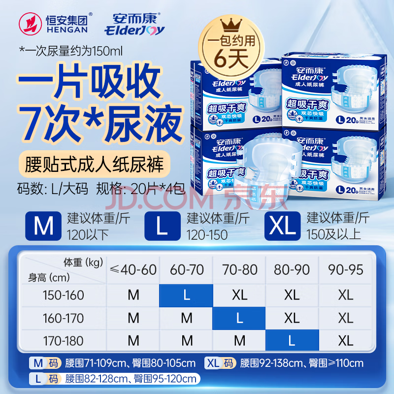 商品相册:安而康(Elderjoy)超吸干爽成人纸尿裤L80片臀围95-120cm成人尿不湿老人快吸防漏第