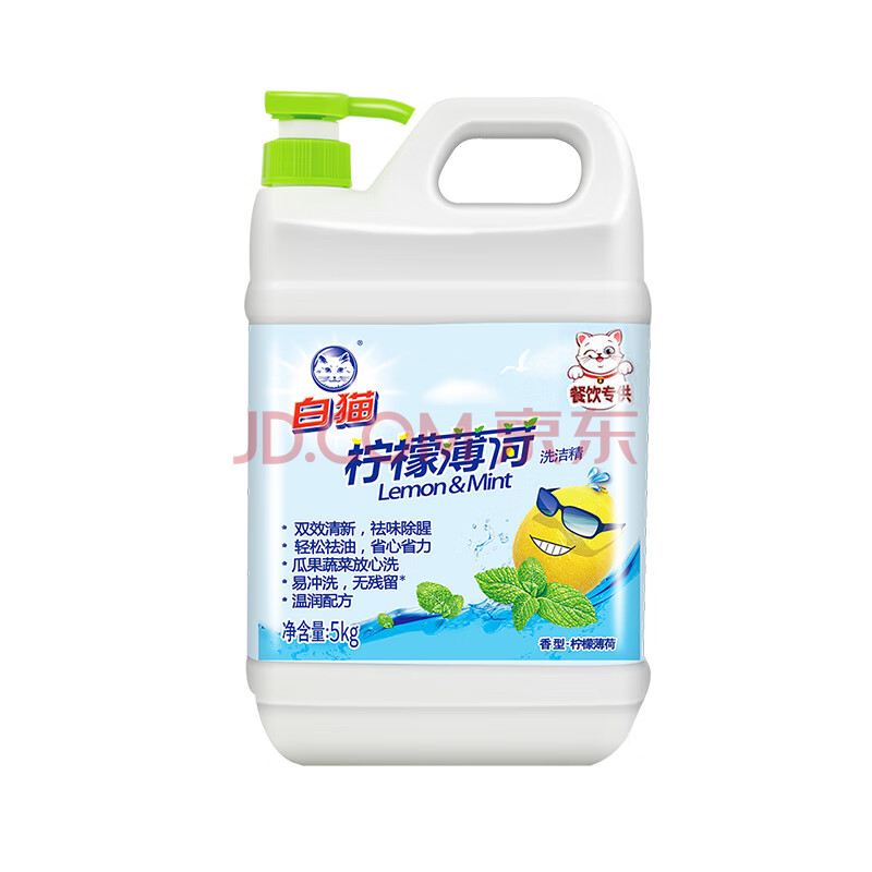 商品相册:白猫 柠檬薄荷洗洁精5kg*4瓶(整箱装) A类食品用祛油除腥青柠薄荷香第1张/共7