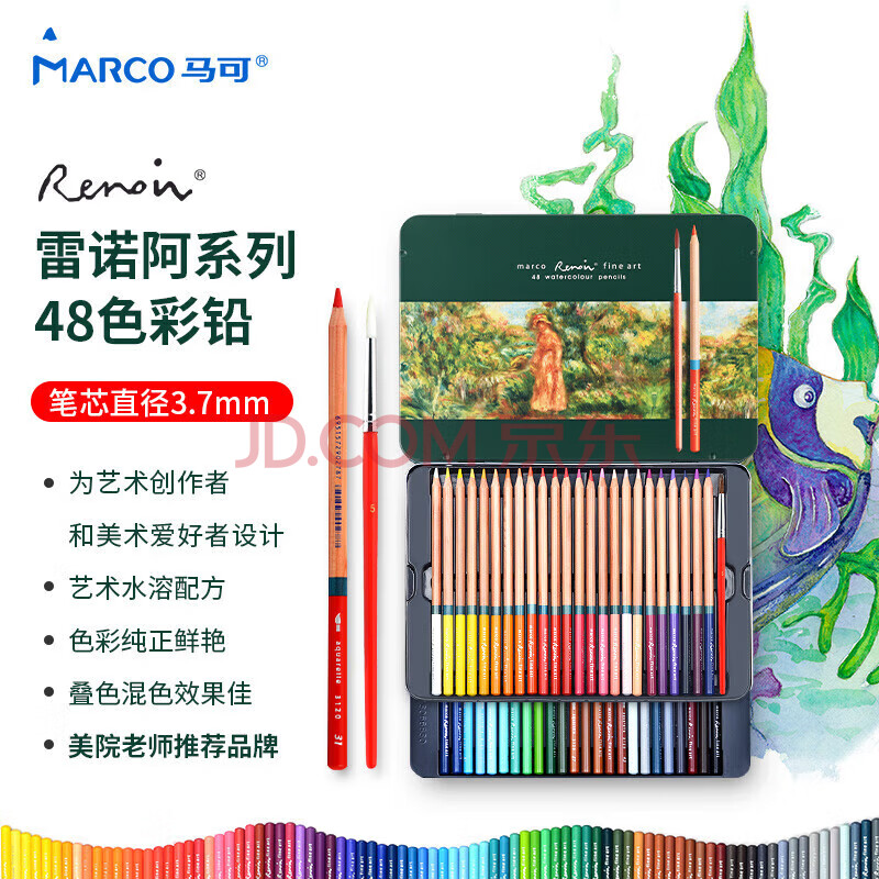 商品相册:马可(MARCO)48色水溶性彩铅美术生专用 雷诺阿铁盒开学生日礼物儿童男女孩学生画风筝出游相纸涂鸦彩色铅笔第1张/共8