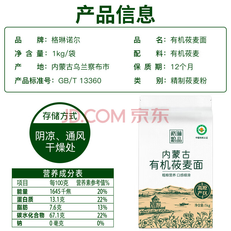 商品相册:格琳诺尔有机莜面2斤 内蒙古莜麦杂粮面粉 莜面鱼鱼原料 粗粮早餐第1张/共8