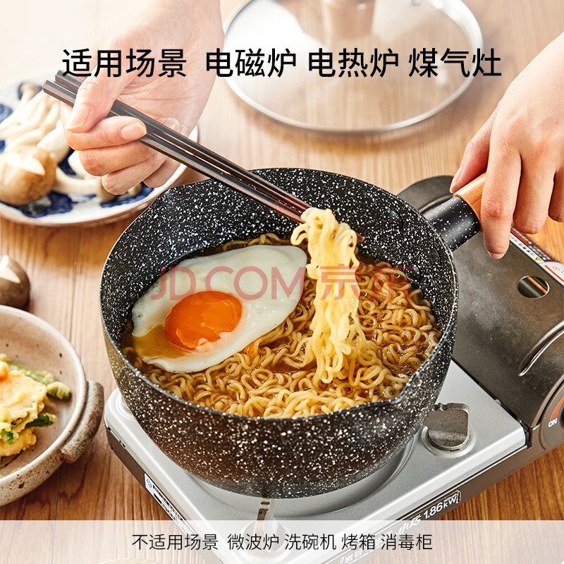 商品相册:京东京造 小奶锅煮面汤锅 麦饭石色不粘锅雪平锅蒸煮辅食锅 带盖18cm第