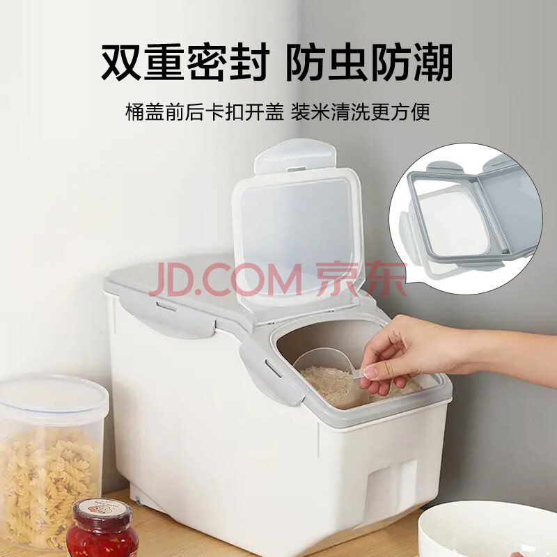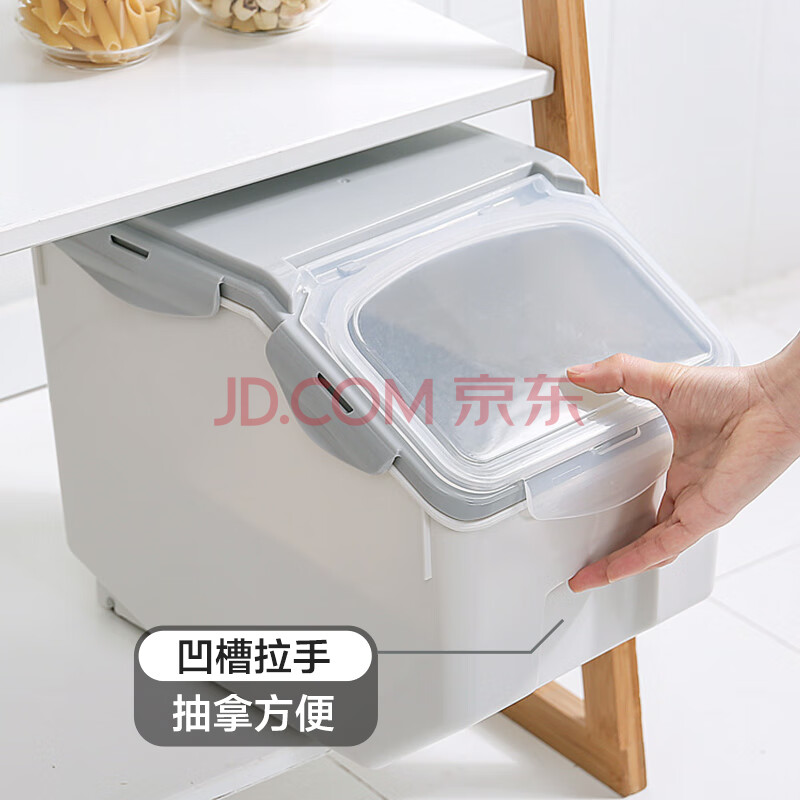 商品相册:京东京造 米桶家用防潮防虫米缸 储米箱 面粉桶 滚轮设计(容纳20斤大米)第1张/共6