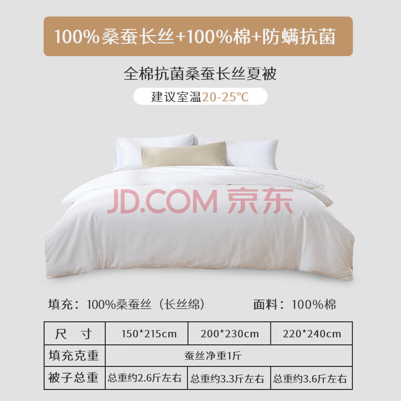 商品相册:太湖雪 100%桑蚕丝空调被 丝重1斤 全棉抑菌胎套 双人被200*230cm白第