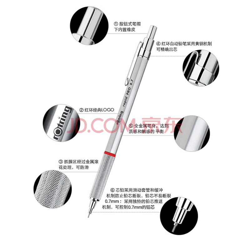 商品相册:红环(rOtring)自动铅笔0.7mm 铅芯不易断 德国高颜值专业绘图工具-Pro系列银色单支装第1张/共7