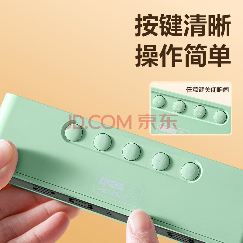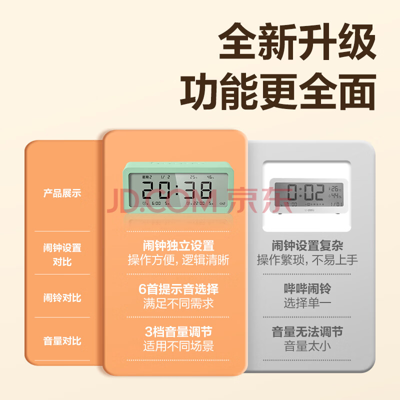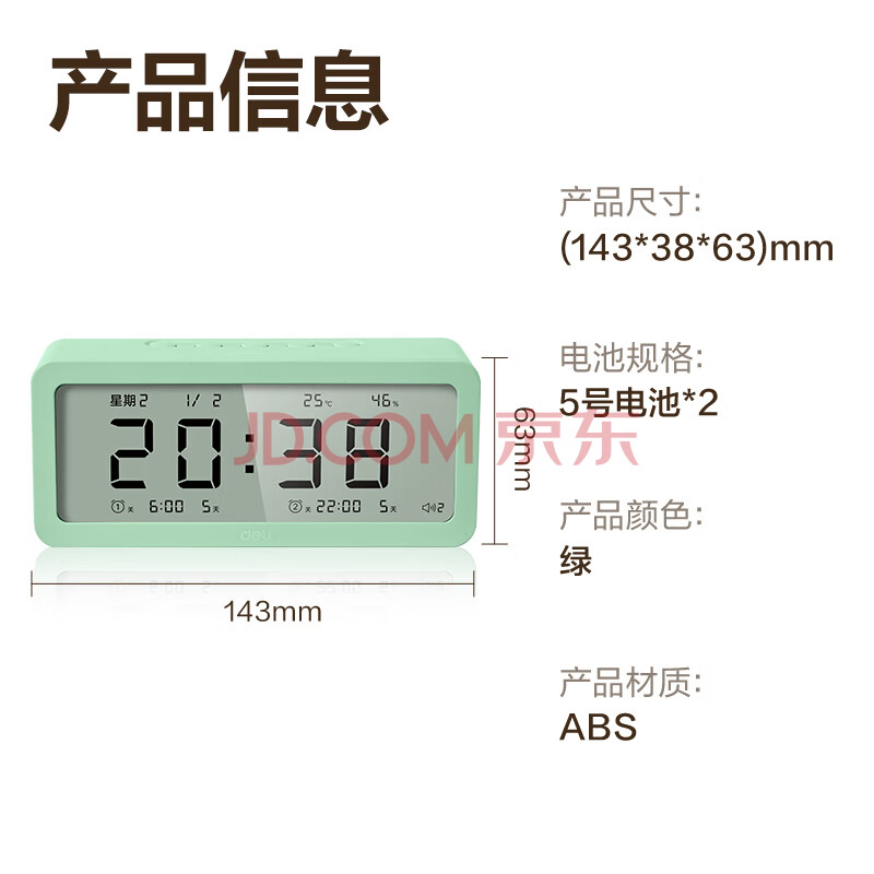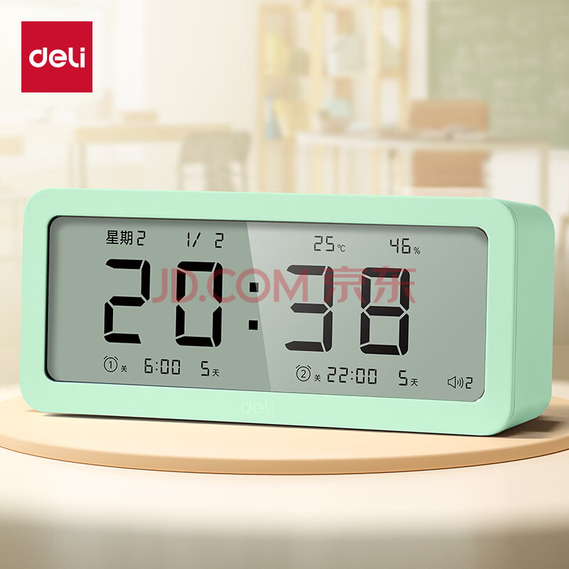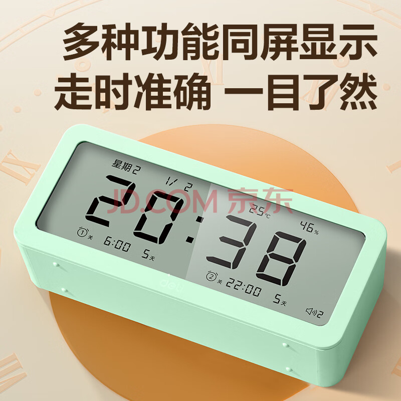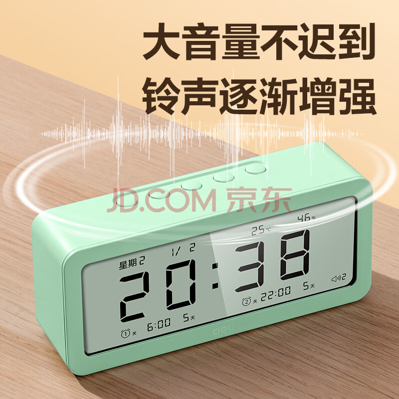 商品相册:得力(deli)多功能电子闹钟 学生儿童专用起床神器背光床头钟时钟时间管理温湿度计 绿色开学必备新年礼物第