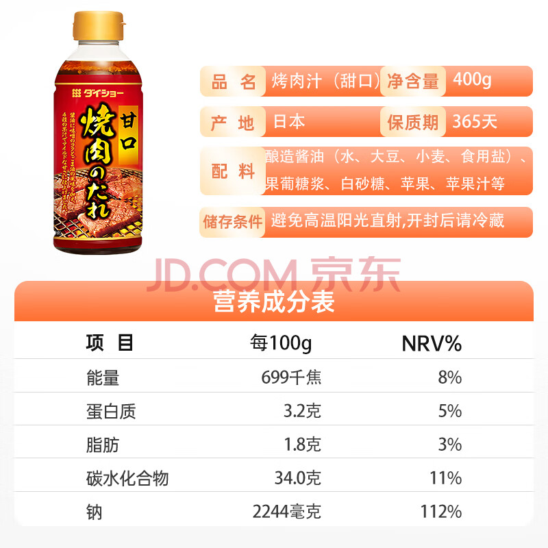 商品相册:大逸昌 日本进口 甘口微甜烤肉汁 日式料理烤肉调味酱烧肉汁 蘸酱400g第