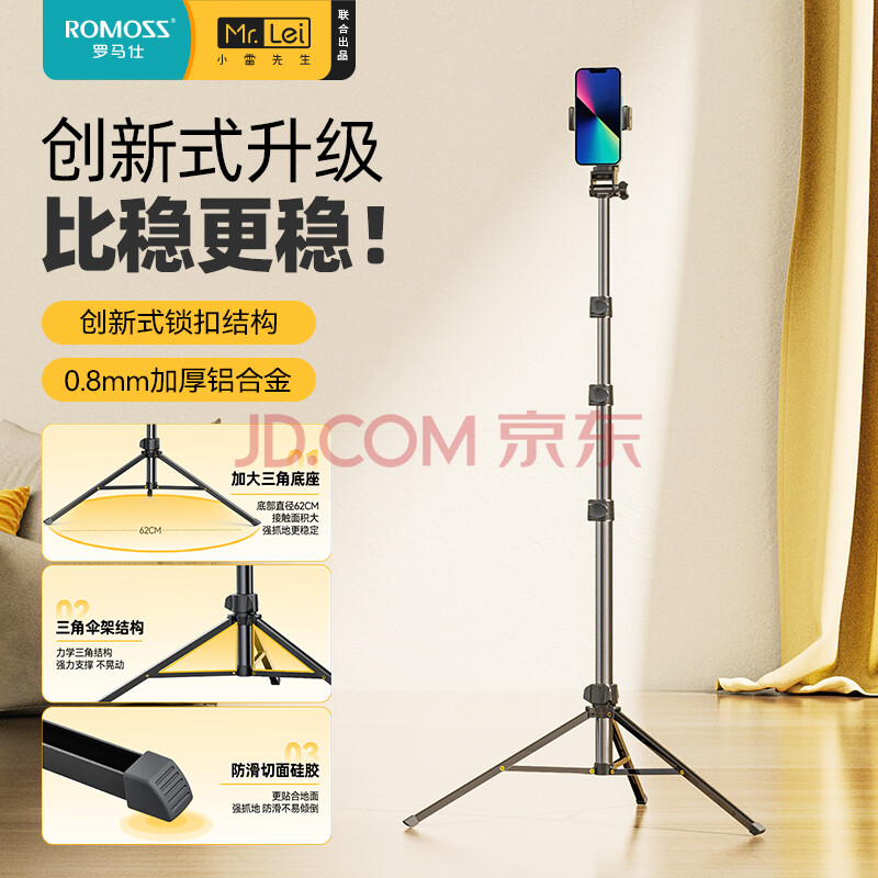 商品相册:小雷先生 手机支架落地直播自拍杆三角架三脚架稳定器摄影神器【锁扣结构防抖丨加厚铝合金丨360°调节】第