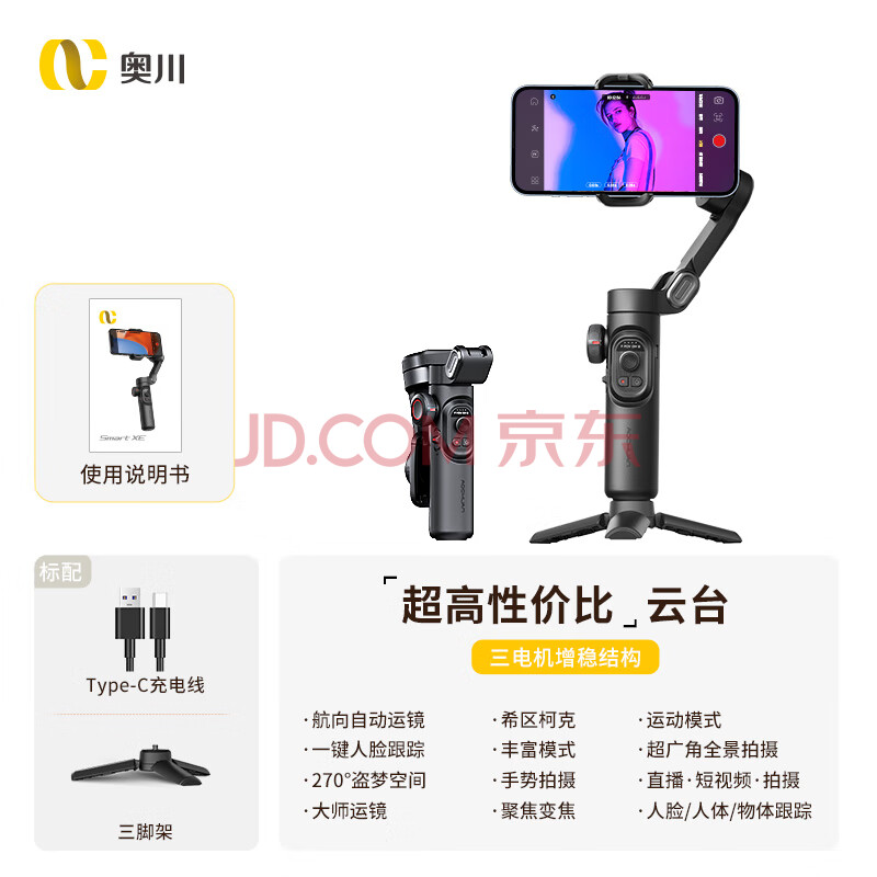 商品相册:奥川SMART XE标配手机稳定器AI跟拍手势防抖小巧便携可折叠vlog神器智能手持云台直播 第