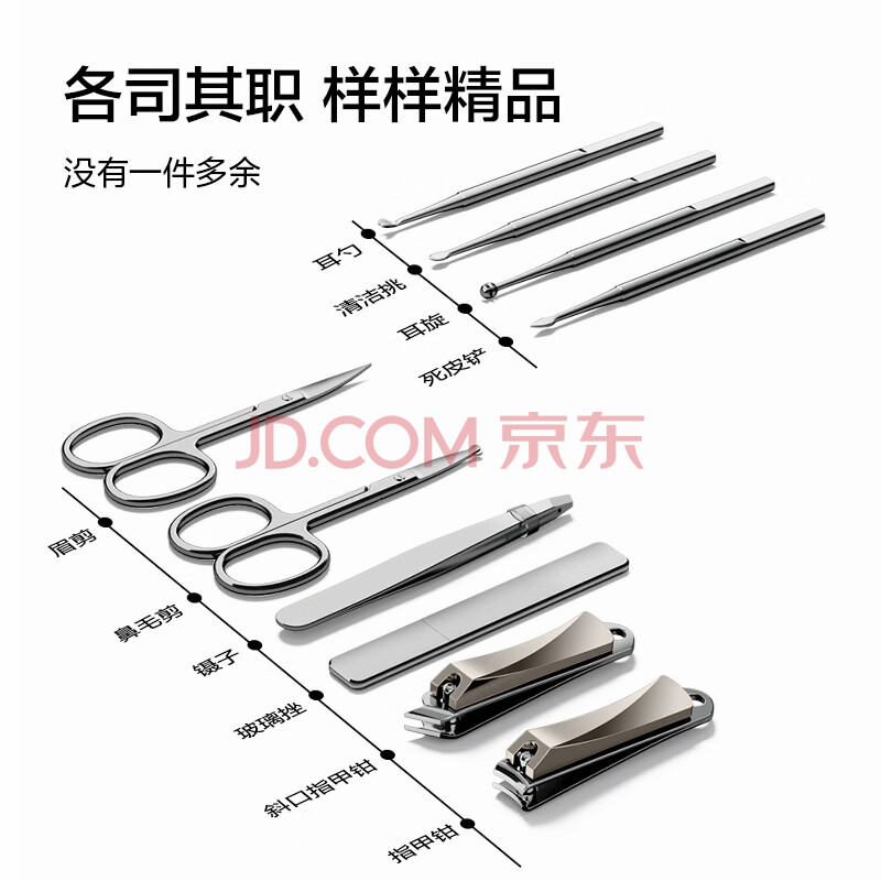 商品相册:京东京造 精工系列德国不锈钢指甲刀套装指甲钳耳勺镊子10件套实用礼物第1张/共8