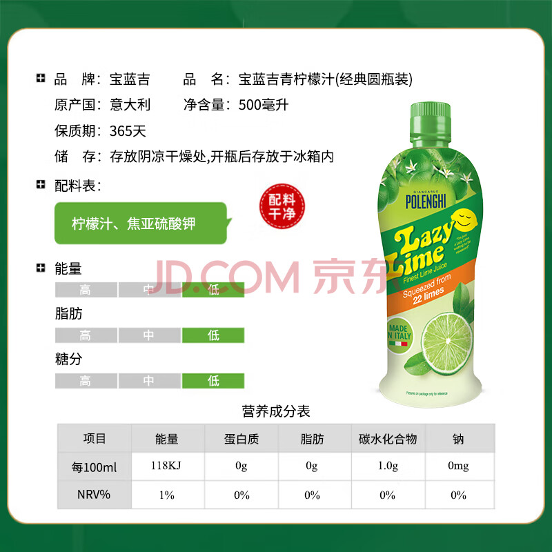 商品相册:宝蓝吉(POLENGHI)意大利进口 青柠檬汁500ml 调味 去腥提鲜 调酒第1张/共4