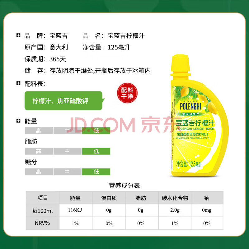 商品相册:宝蓝吉(POLENGHI)意大利进口 柠檬汁125ml 烘焙原料 调味 调酒 去腥第1张/共6