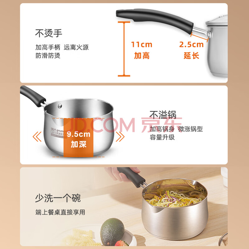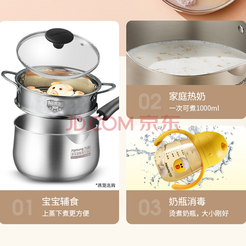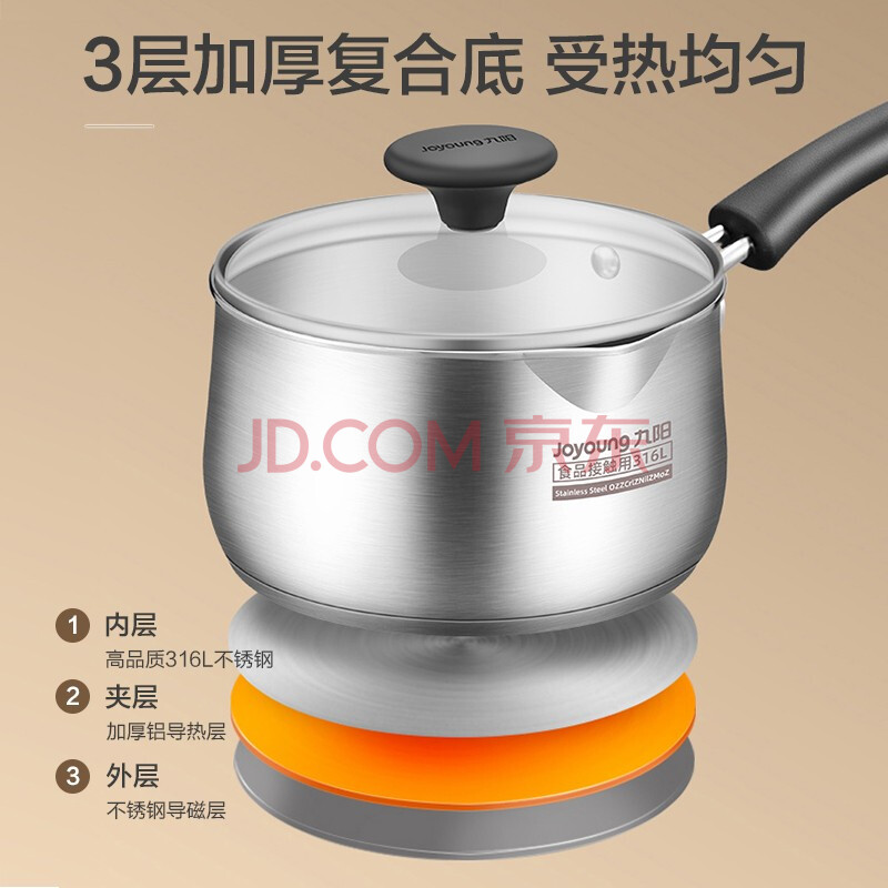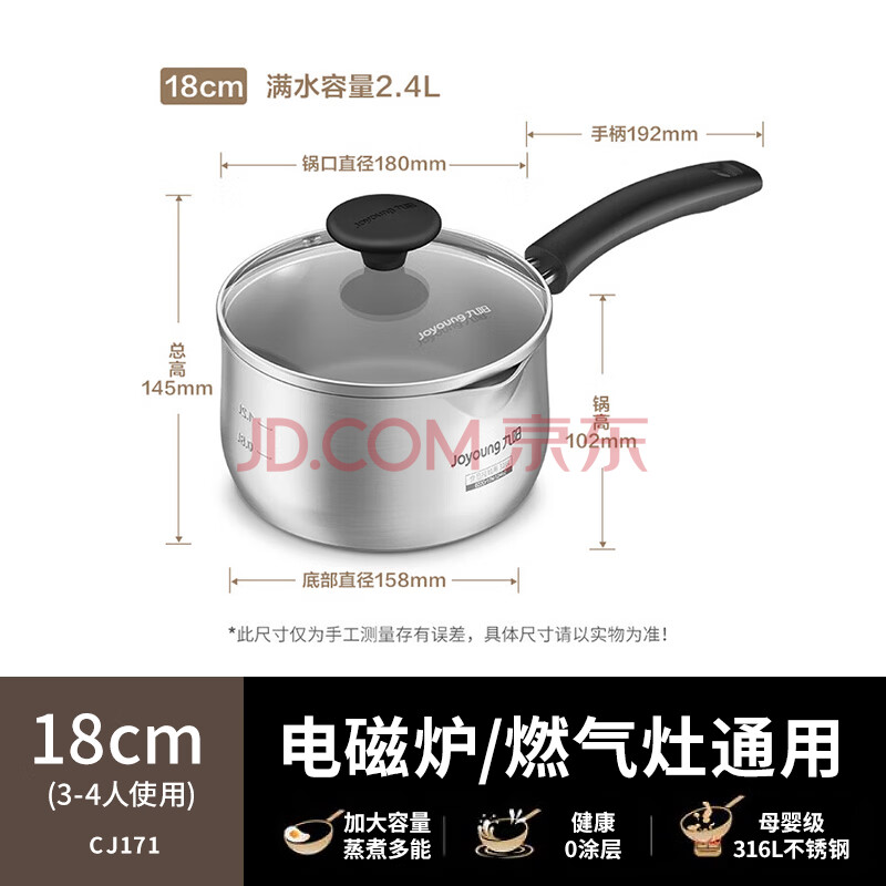 商品相册:九阳(Joyoung)奶锅316L不锈钢宝宝辅食锅泡面热奶汤锅燃气电磁炉通用18cm第