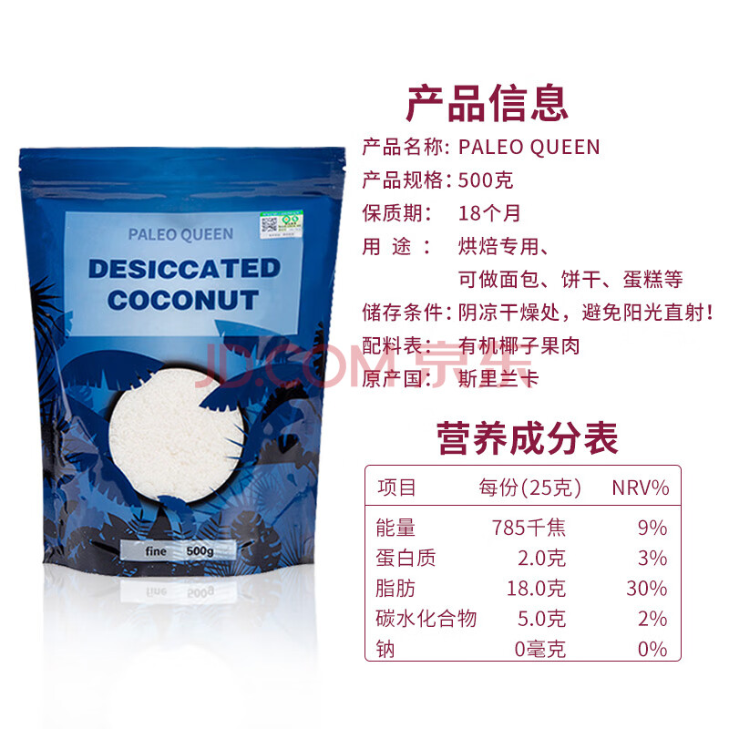 商品相册:派里奥(Paleo queen)五项有机椰蓉椰丝500g 原装进口面包蛋糕饼干烘焙装饰原料第1张/共8