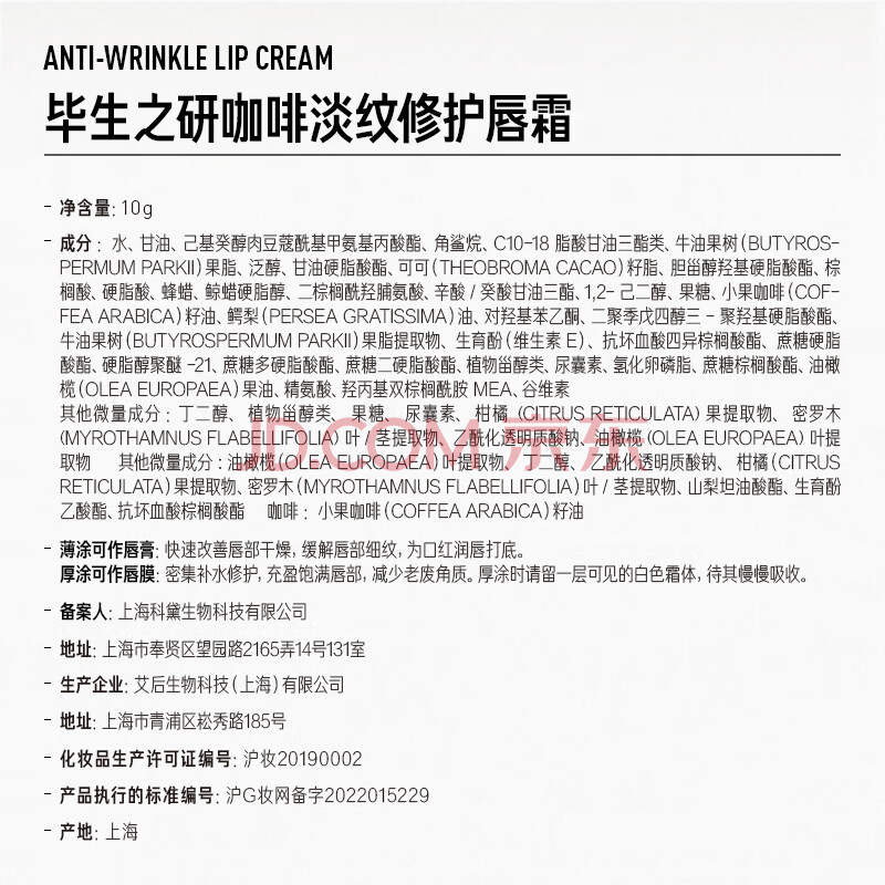 商品相册:毕生之研咖啡唇霜10g淡化唇纹唇部精华润唇膏滋润保湿唇油去死皮女第