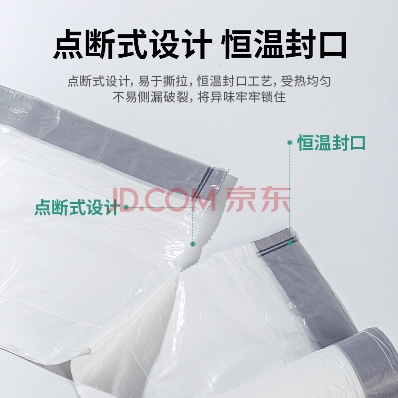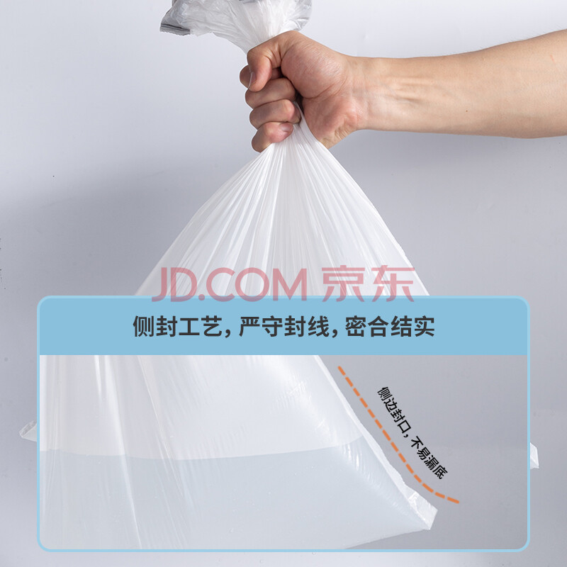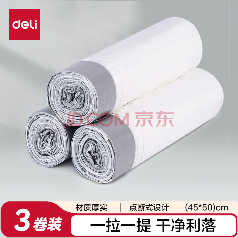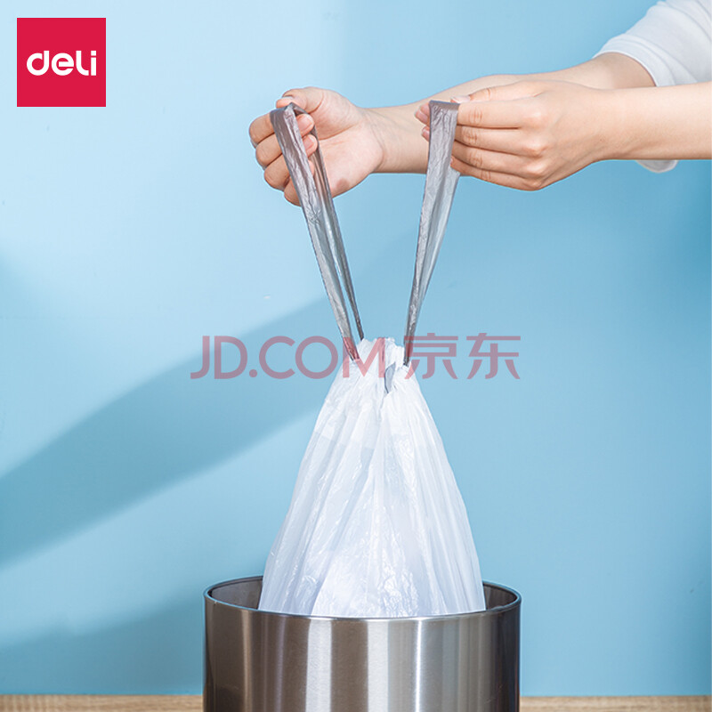 商品相册:得力(deli)45*50cm抽绳式垃圾袋便携牢固加厚大容量居家用办公宿舍耐用量多垃圾收纳 3卷装 白色18751第1张/共6