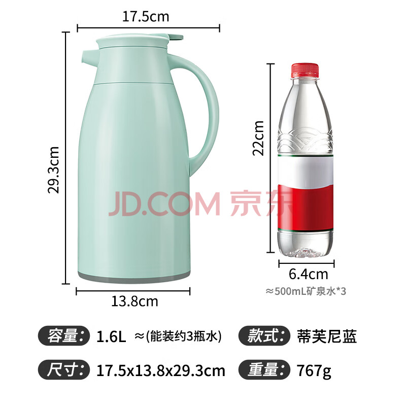 商品相册:JEKO&JEKO保温壶家用热水瓶暖水壶宿舍大容量开水瓶玻璃内胆 1.6L淡蓝色第1张/共7