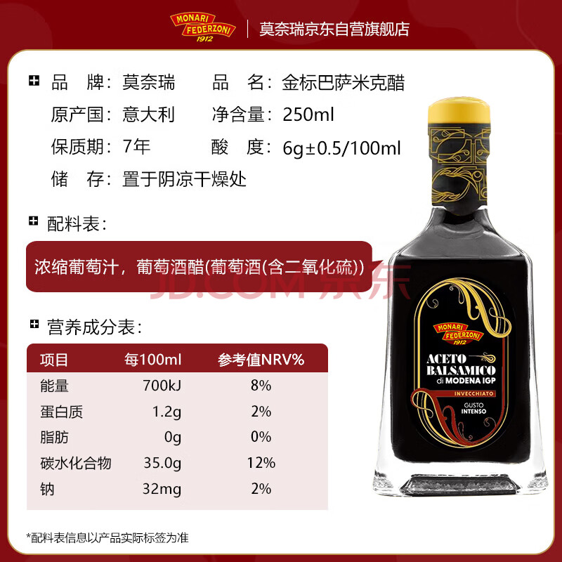 商品相册:莫奈瑞金标黑醋250ml【意大利进口IGP3年陈酿】酿造果醋香醋沙拉油醋汁第
