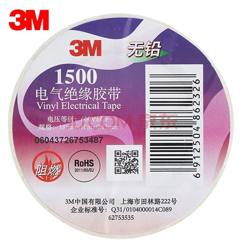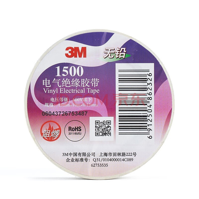 商品相册:3M 1500# 办公家装 通用型电工电气绝缘胶带 无铅阻燃耐高温 白色 18mm*10m*0.13mm 5卷装第