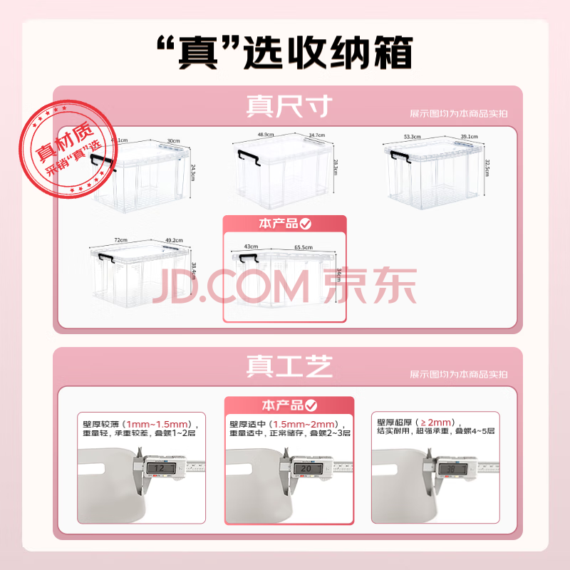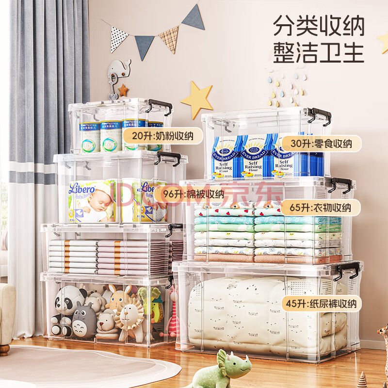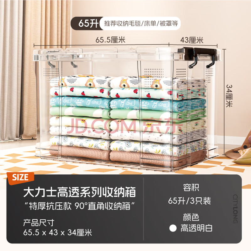 商品相册:禧天龙直角收纳箱加厚大力士塑料衣物玩具搬家整理箱无轮 65L透明3个装第
