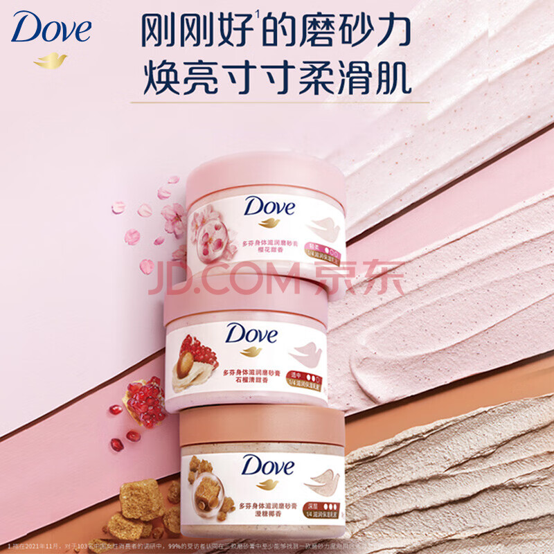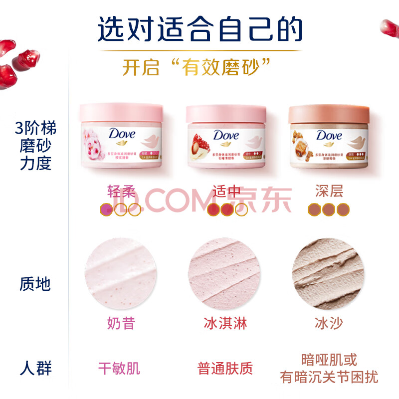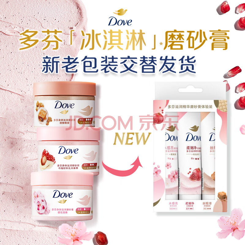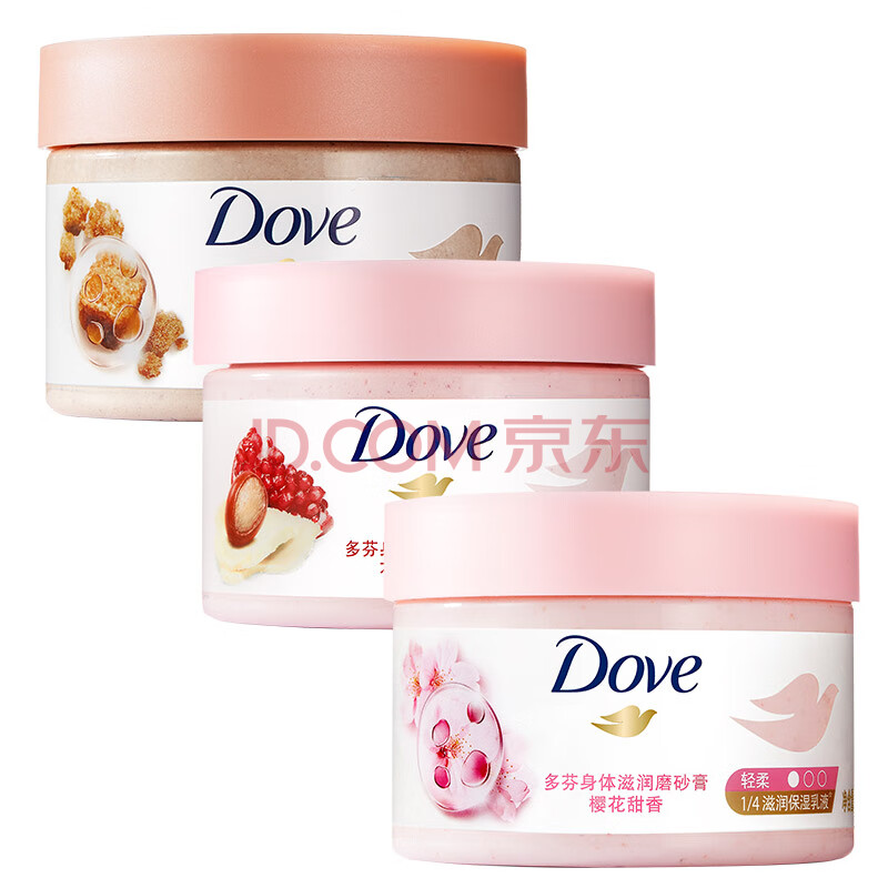 商品相册:多芬身体滋润磨砂膏全身温和磨砂 石榴+樱花+澄糖 (50G+50G+50G) 新老装交替发货第