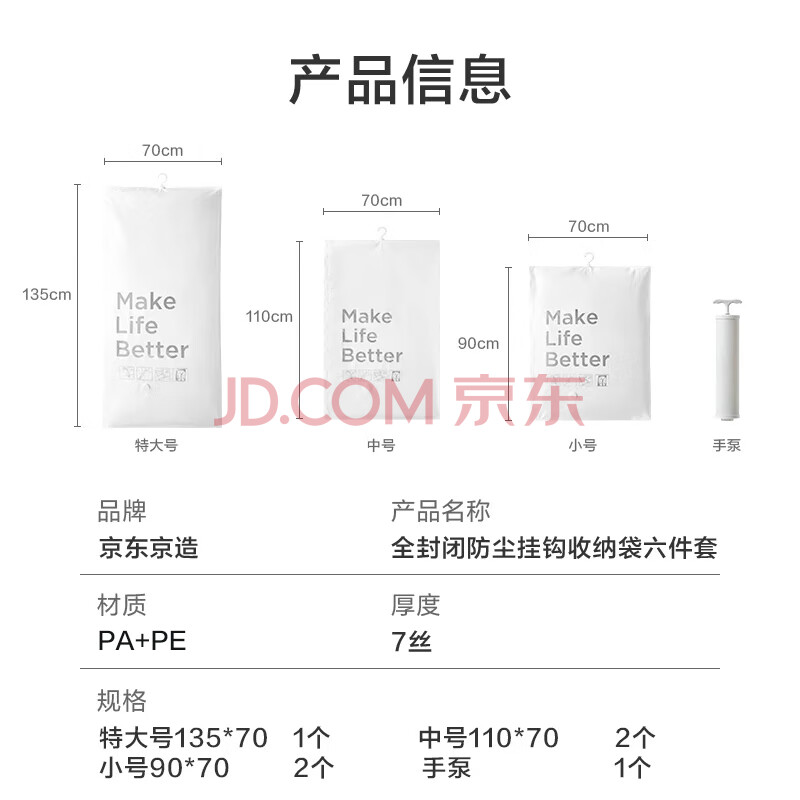 商品相册:京东京造 简约生活真空收纳袋 搬家打包袋压缩袋棉被子6件套【自带挂钩】第1张/共5