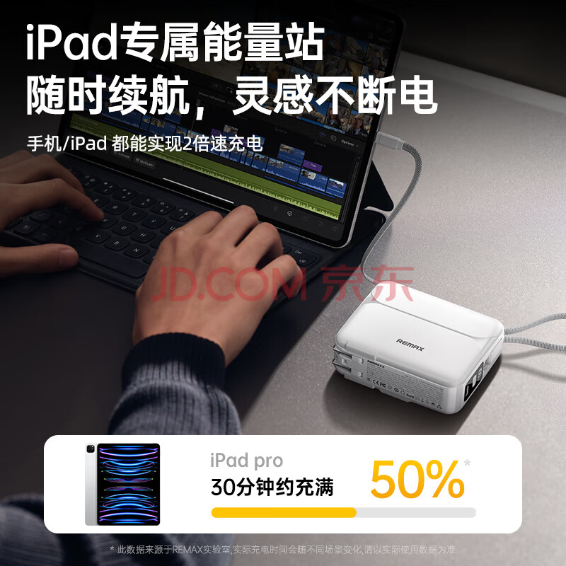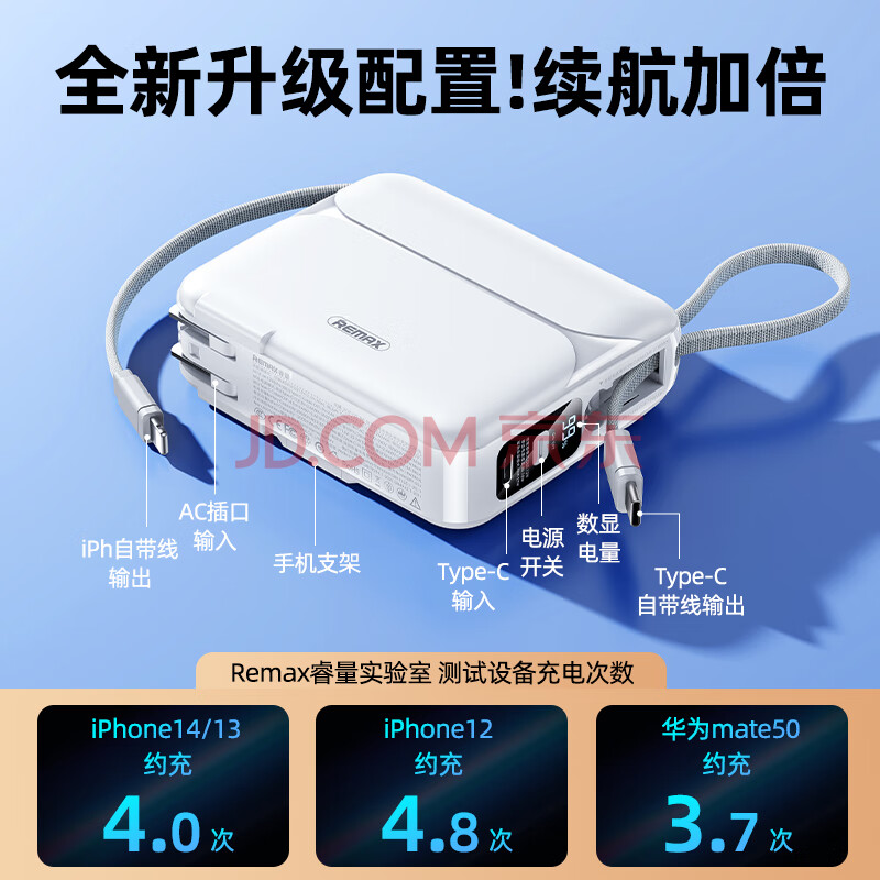 商品相册:睿量(REMAX)【3C认证】三合一充电宝20000毫安时27W快充自带双线AC插头大容量移动电源适用苹果16华为可上飞机第1张/共9