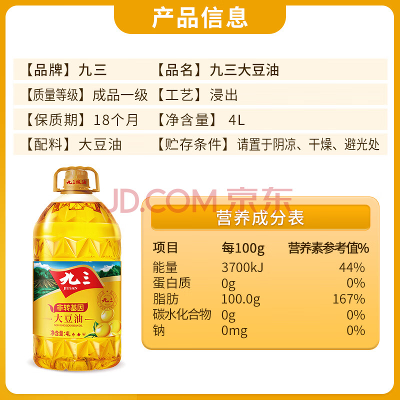 商品相册:九三 非转基因 一级 大豆油 4L第1张/共7