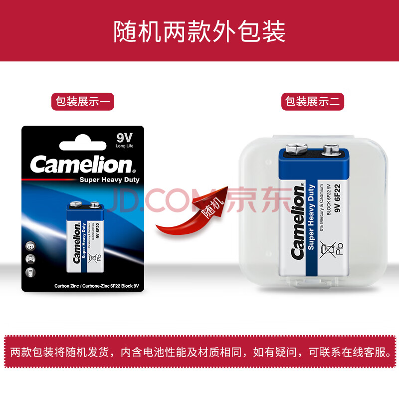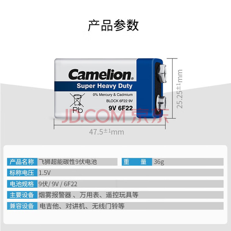商品相册:飞狮(Camelion)碳性电池 干电池 6F22/9V/9伏 电池 1节 遥控玩具/烟雾报警器/无线麦克风第