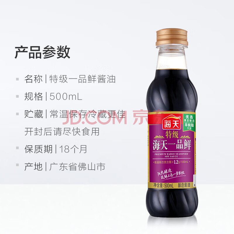 商品相册:海天 酿造酱油 特级一品鲜生抽500ml*6(PET瓶)鲜味十足 调味品第1张/共5