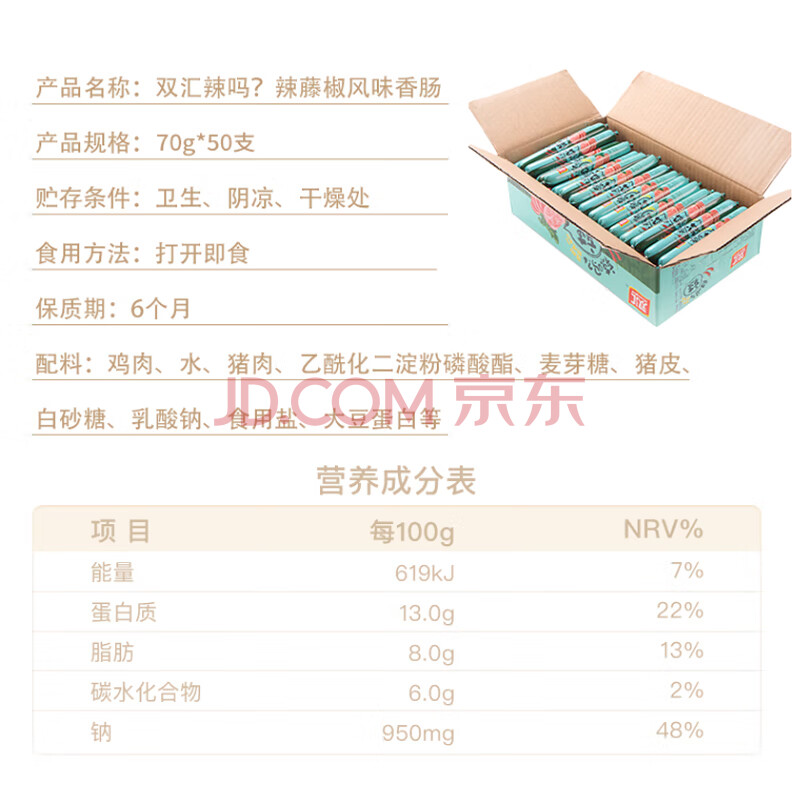 商品相册:双汇辣吗?辣 藤椒风味火腿肠香肠 70g*50支 整箱装 休闲零食 即食第
