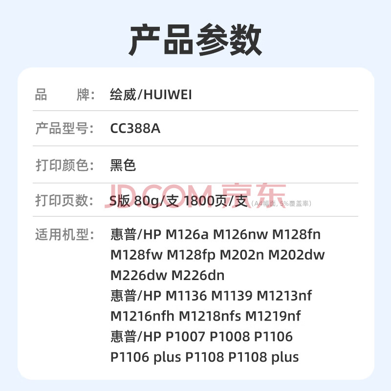 商品相册:绘威cc388a碳粉适用惠普m1136 m126a墨粉P1108 p1106 m126nw p1007 p1008 m1213nf 1216nfh hp打印机硒鼓88a碳粉第