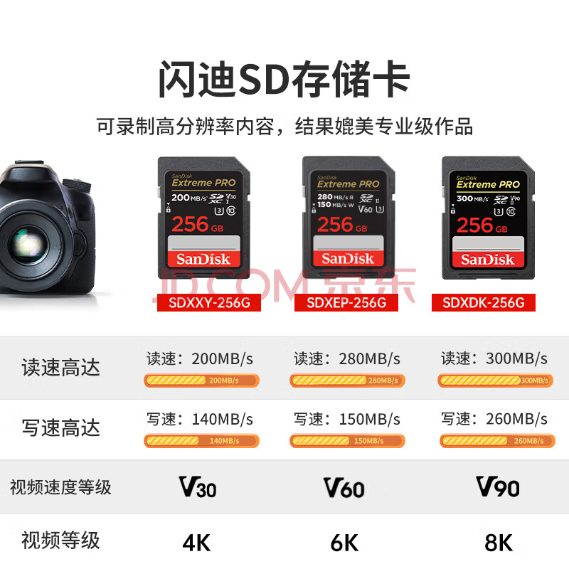 商品相册:闪迪(SanDisk)256GB SD内存卡 4K V30 U3 C10 相机存储卡 读速200MB/s 写速140MB/s 微单/单反相机内存卡第