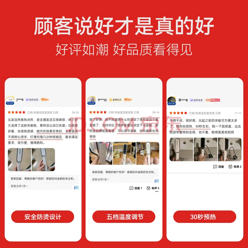 商品相册:金稻直发梳夹板卷发棒内扣直板夹造型高颅顶改善毛躁蓬松梳子恒温护发KD380粉色生日礼物便携出游发型第