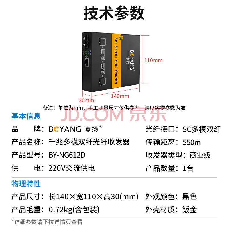商品相册:博扬(BOYANG)千兆多模光纤收发器双纤 多模光电转换器 光电收发器 防雷SC接口 550m内置电源 一台BY-NG612D第