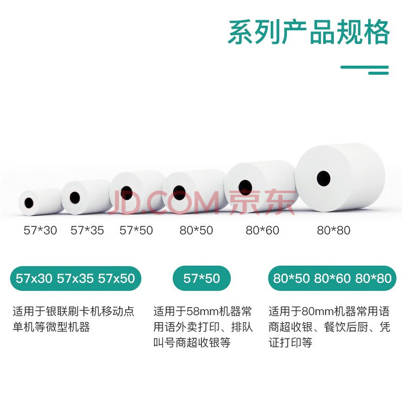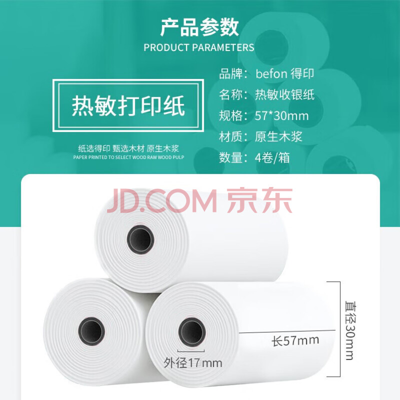 商品相册:得印(befon)57*30mm热敏收银纸 刷卡机 超市收银机小票纸 4卷/盒 口袋打印机 喵喵机/咕咕机热敏纸第1张/共6