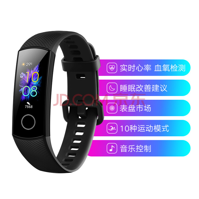 商品相册:荣耀手环5 陨石黑 智能运动 幻彩屏触控 表盘市场 睡眠、血氧检测 实时心率 50米防水+泳姿识别 移动支付第