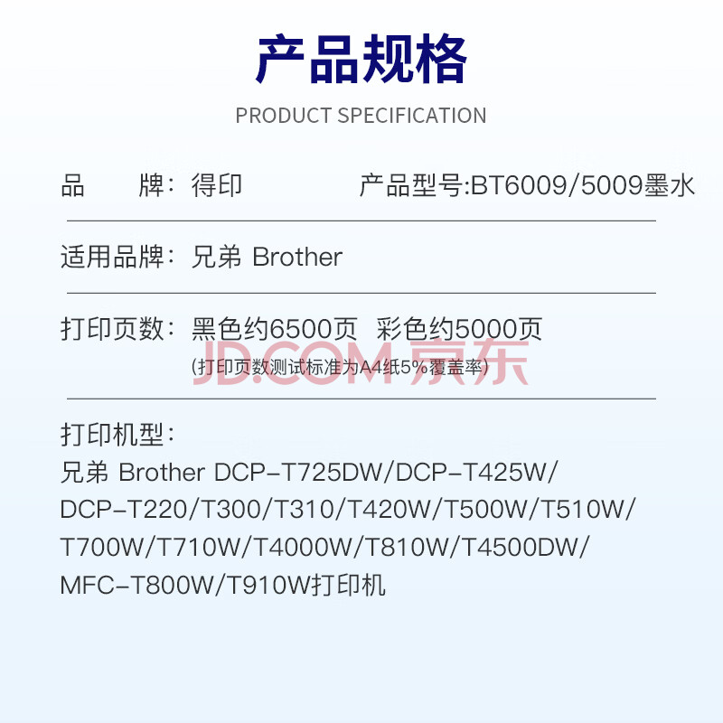 商品相册:得印BT-D60BK/5009墨水黑色适用兄弟DCP-T425W T725DW T426W 420W T310 720DW 710W T220打印机墨水第