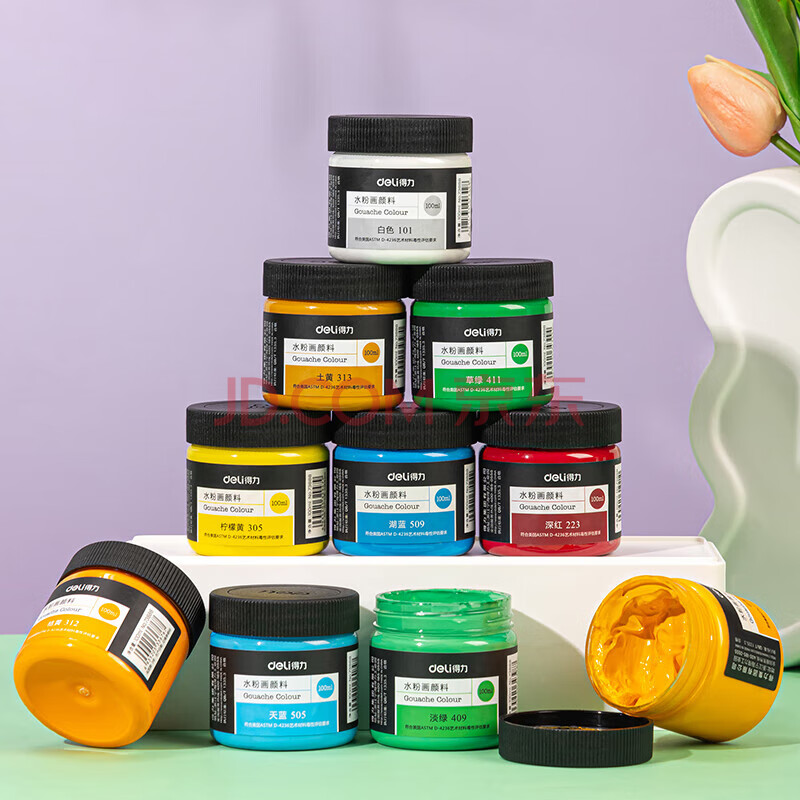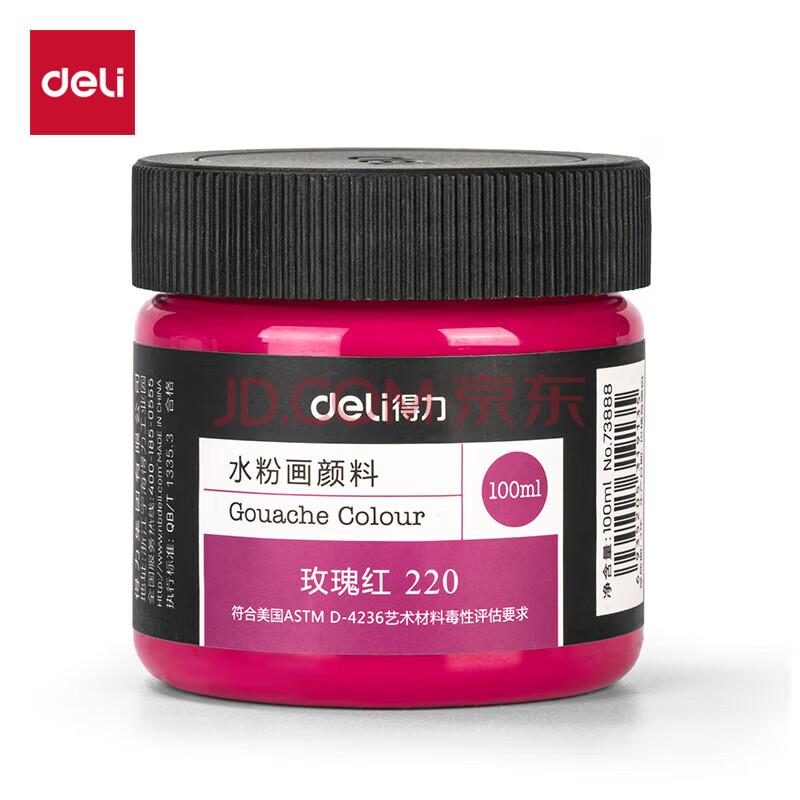 商品相册:得力(deli)水粉颜料玫瑰红100ml大容量罐装画画美术专用水粉画绘画彩绘艺考初学者73888可水洗手搓颜料第1张/共6