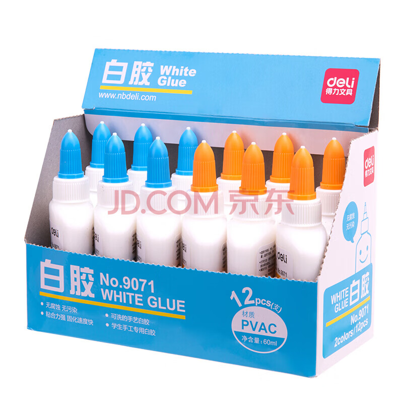 商品相册:得力(deli)(deli)60ml手工白胶 学生开学文具DIY白乳胶 环保无甲醛可水洗胶水 学习用品12支装 9071第