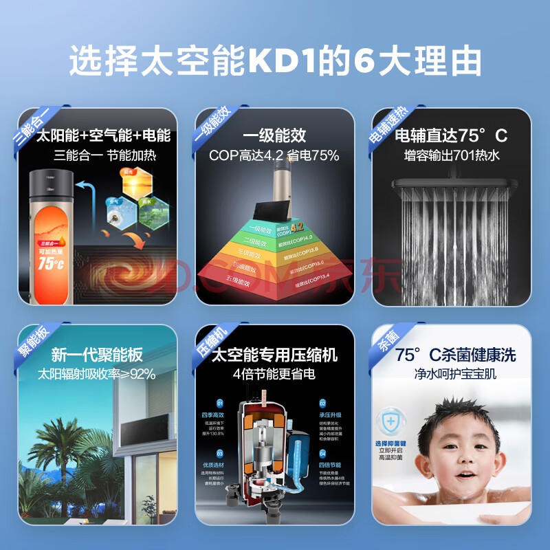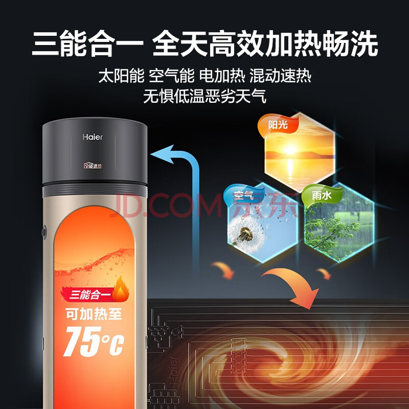 商品相册:海尔(Haier)太空能空气能太阳能热水器二合一家用200升一级能效平板式WIFI全屋热水75°C TK48/200-KD1(U1)第