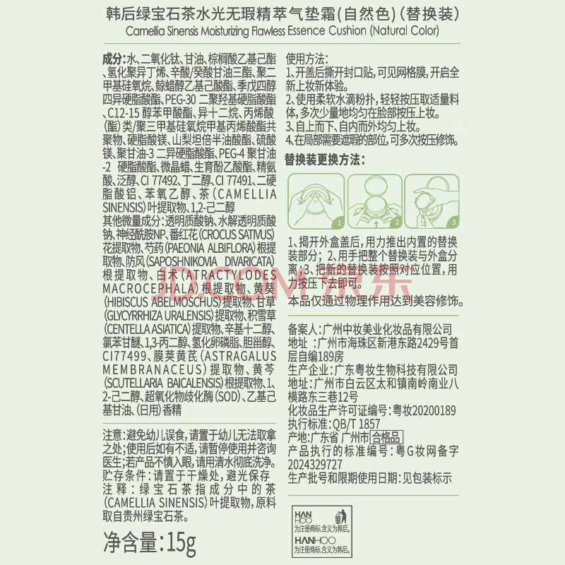 商品相册:韩后绿宝石水光无暇精萃气垫霜15g BB霜粉底液遮瑕化妆品(替换装)第